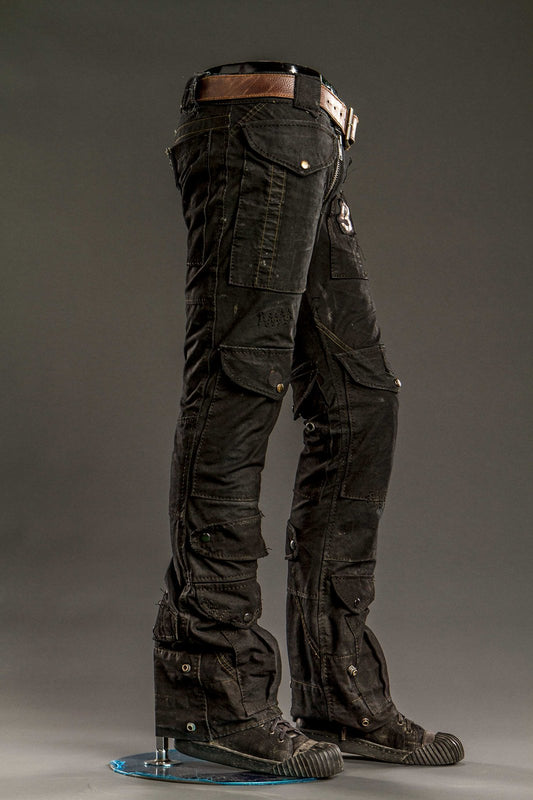 Forget designer denim that falls apart after one slam pit. Junker's Damage Control Pants Collection isn't manufactured—it's weaponized from society's discards.